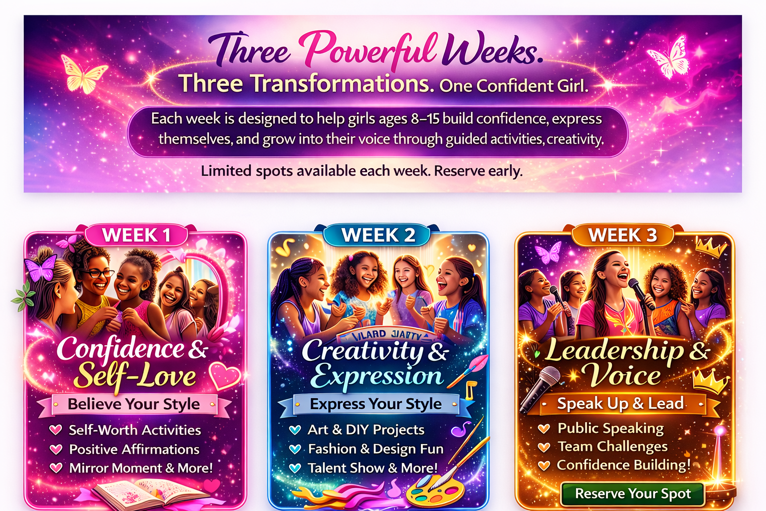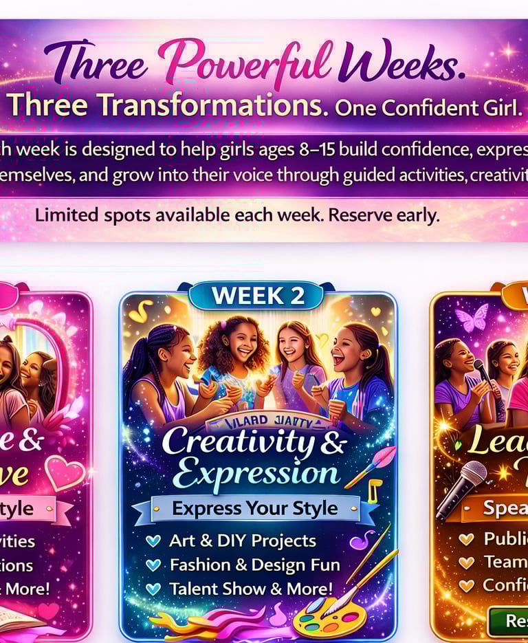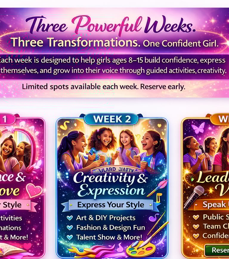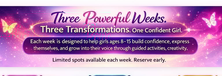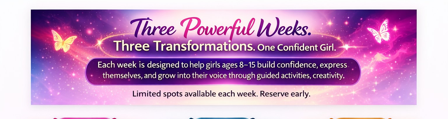 An unforgettable experience where girls build confidence, discover their voice, and step into the strong, confident young woman they’re meant to be.