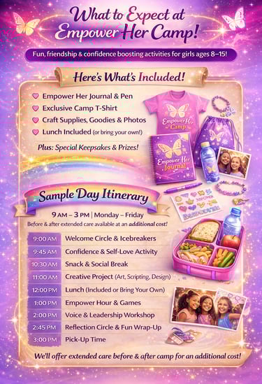Empower HER is designed to help girls grow in confidence, self-expression, and connection through meaningful activities, positive mentorship, and unforgettable summer moments.